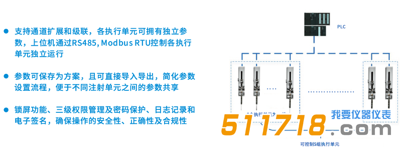 支持通道擴(kuò)展和級聯(lián),各執(zhí)行單元可擁有獨自參數(shù),上位機通過RS485, Modbus RTU控制各執(zhí)行單元獨自運行