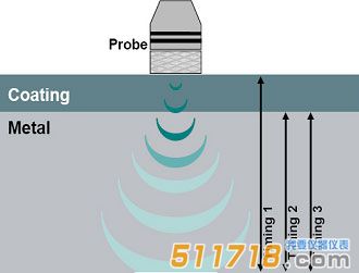 發(fā)射的超聲波脈沖穿過(guò)涂層與金屬并從底部反射。反射回波在金屬中往復(fù)反射,每次只有一小部分回波穿過(guò)涂層返回。兩個(gè)小回波之間的時(shí)間即是聲波在金屬中的傳播時(shí)間,與金屬厚度相對(duì)應(yīng)?;夭ú恍枰沁B續(xù)的,儀器可以自動(dòng)判斷回波并計(jì)算出厚度值。每次確認(rèn)很小的三個(gè)回波,即自動(dòng)測(cè)量驗(yàn)證系統(tǒng)(AMVS)。